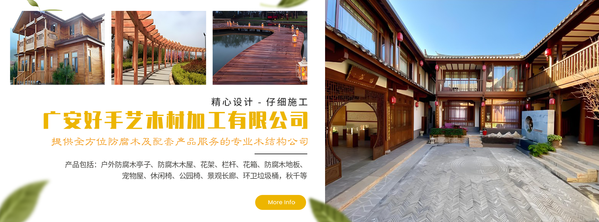 廣安好手藝木材加工有限公司專業(yè)從事防腐木木材的生產(chǎn)及銷售,企業(yè)立足防腐木材生產(chǎn)、銷售、設(shè)計(jì)、咨詢?yōu)橐惑w的綜合性企業(yè),產(chǎn)品包括:戶外防腐木亭子、防腐木木屋、花架、欄桿、花箱、防腐木地板、寵物屋、休閑椅、公園椅、景觀長廊、環(huán)衛(wèi)垃圾桶,秋千等公共配套設(shè)施的生產(chǎn)、銷售、安裝。 公司擁有一批從事木材研究的技術(shù)人,及精良的安裝施工隊(duì)伍,現(xiàn)代化的生產(chǎn)設(shè)備。經(jīng)過風(fēng)雨歷練,積累了大量的采購、開發(fā)、研究生產(chǎn)、銷售、安裝防腐木材的豐富經(jīng)驗(yàn)。 產(chǎn)品可廣泛應(yīng)用于公共休閑場所、湖邊棧道、旅游景點(diǎn)、戶外